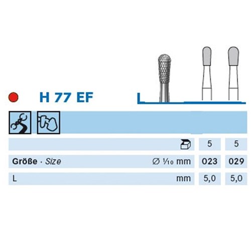H77E pear, tungsten carbide. HP 104 shank for laboratory handpiece Size 023 (2.3mm) diameter with 5mm working length. For acrylics, plaster and metal alloys.
