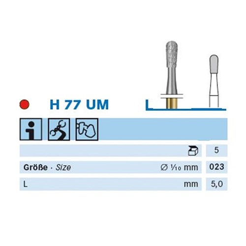 H77UM pear, tungsten carbide. HP 104 shank for laboratory handpiece Size 023 (2.3mm) diameter with 5mm working length. For non-precious metal, precious metal and model cast alloys.