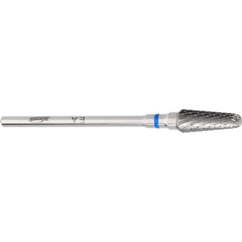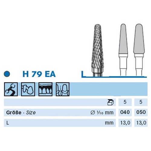 H79EA tapered round tungsten carbide, safety toothing with a twist to the left. HP 104 shank for laboratory handpiece Size 050 (5.0mm) diameter with 13mm working length. For acrylics, plaster and metal alloys.