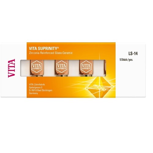 VITA Zahnfabrik offers VITA SUPRINITY, a new generation of glass ceramic material products. With the aid of an innovative manufacturing process, the glass ceramic is enriched with zirconia (approx. 10 % by weight). The result is the world‘s first zirconia reinforced lithium silicate ceramic (ZLS)*. This new glass ceramic features a special fine-grained and homogeneous structure which guarantees excellent material quality and consistent high load capacity, as well as long-term reliability. Moreover, the material also offers outstanding processing characteristics such as easy milling and polishing. Thanks to the excellent translucency, fluorescence and opalescence of this new glass ceramic material, VITA SUPRINITY provides excellent esthetic properties. Indications Various (esthetic) options and hence wide indication range:
