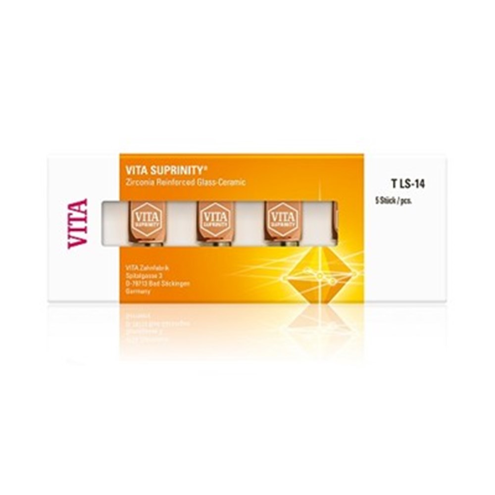VITA Zahnfabrik offers VITA SUPRINITY, a new generation of glass ceramic material products. With the aid of an innovative manufacturing process, the glass ceramic is enriched with zirconia (approx. 10 % by weight). The result is the world‘s first zirconia reinforced lithium silicate ceramic (ZLS)*. This new glass ceramic features a special fine-grained and homogeneous structure which guarantees excellent material quality and consistent high load capacity, as well as long-term reliability. Moreover, the material also offers outstanding processing characteristics such as easy milling and polishing. Thanks to the excellent translucency, fluorescence and opalescence of this new glass ceramic material, VITA SUPRINITY provides excellent esthetic properties. Indications Various (esthetic) options and hence wide indication range:
