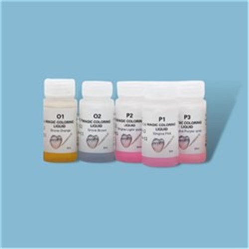 Incisal colours - liquid blue (T1), light grey (G1), grey (G2), dark grey (G3), tooth fossa - orange (O1), dark orange (O2), gingiva colour - pink (P1), light purple (P2), purple pink (P3).