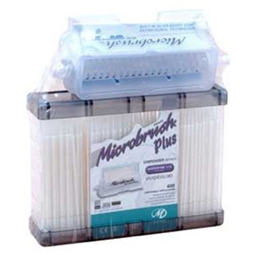 Non-linting, non-absorbent fiber tips hold solution in suspension until applied. Applicators bend easily for accurate placement of solution in hard to reach areas. Each Microbrush Plus series kit contains one sion Dispenser and 400 applicators. The disposable cartridges and applicators are specially designed to fit the dispenser.