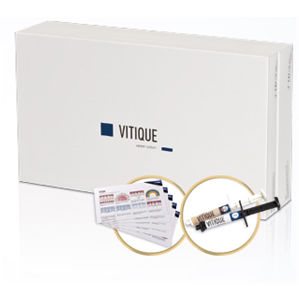 Vitique offers you all the options for cementing aesthetically challenging veneer restorations. The Vitique System consists of two perfectly coordinated kits: the Cementation Kit with cements and try-ins, and the complementary Accessory Kit with etching gel, silane and bond. The flexible shade selection meets all aesthetic requirements. The three shades in the Cementation Kit can be supplemented with five additional shades as desired. Precisely matched try-in pastes allow an accurate preview of the exact result.
