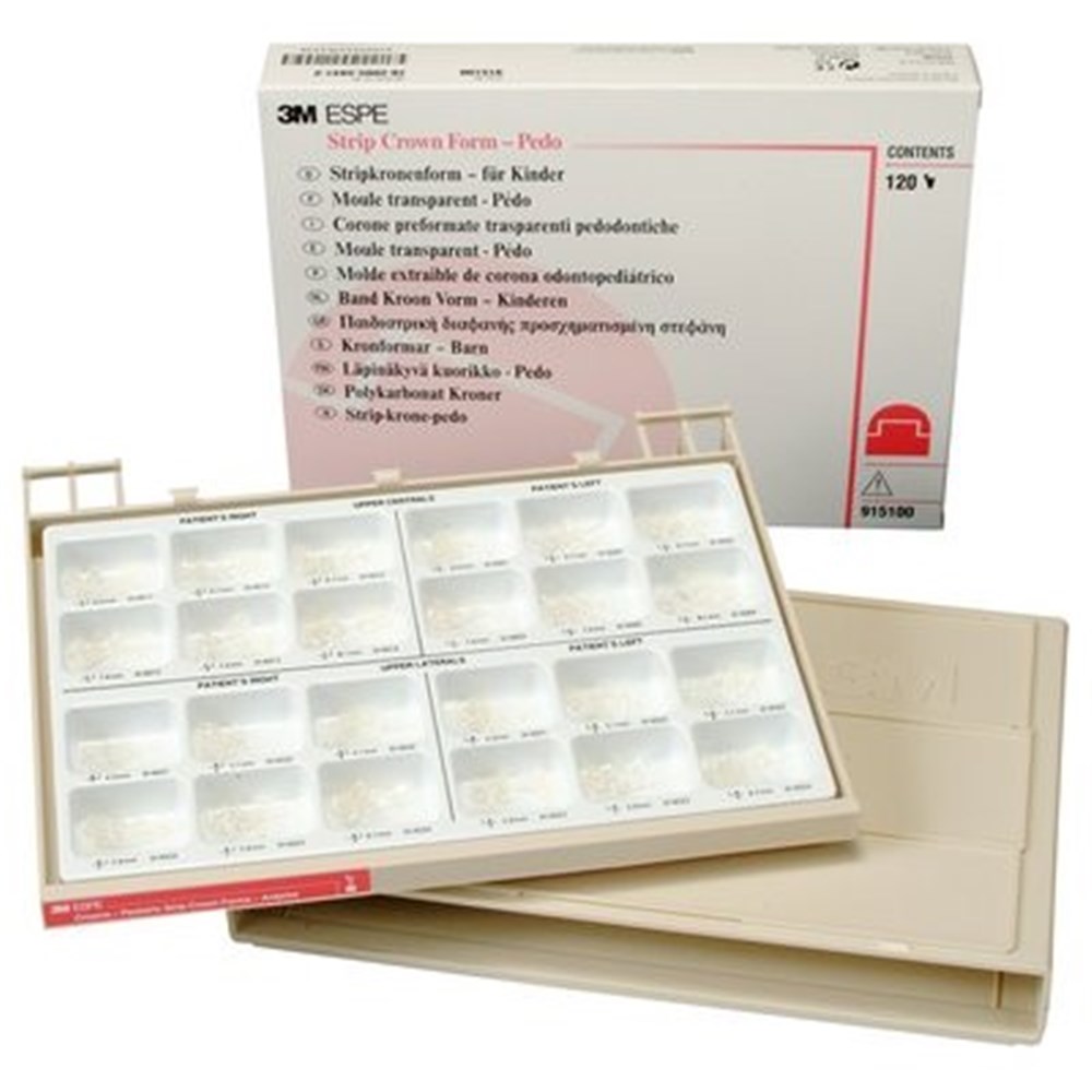 Prefabricated, transparent strip crowns for primary anterior applications. The strip crowns are ideal for use with chemical or light-cured composites. Refills of individual primary anterior strip crowns are available in boxes of five.