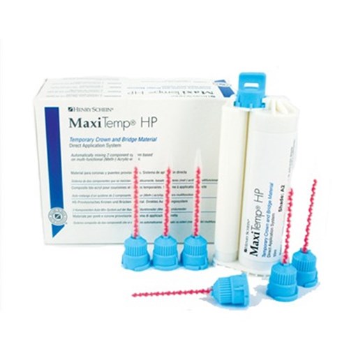 MaxiTemp HP is an automix crown and bridge acrylic for creating temporary crowns, bridges, inlays and onlays, and veneers. The temporary restoration can be produced in the mouth or on a model. High performance, crown and bridge materialBased on multifunctional methacrylic estersSelf cure, fast setting, automix (4:1)High polishability and colour stabilityExcellent marginal adaptation and fitSuperior biocompatibility and colour stabilityCan be trimmed after 6 minutes (including mix time).Contains: 1 - 50 mL cartridge & 6 mixing tips.