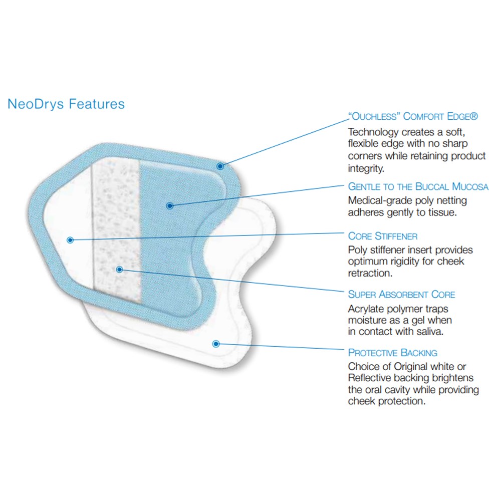 NEODRYS with its new inner core traps moisture quickly, helping to provide a superior dry field. No messy leaks, even with the core fully saturated. Its moisture-proof backing protects the cheek from abrasion and bounces light into the working area. With the new COMFORT EDGE, there is no stiff abrasive material to cause discomfort. Absorption, protection and comfort make NEODRYS far superior to any other product on the market. NEODRYS is available in two sizes large (blue) and small (yellow). PLUS a choice of two kinds of backing; white and new reflective.