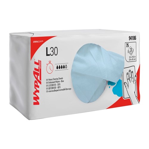 - One case of WYPALL® L30 embossed wipers contains 10 packs; each pack contains 75 blue, 3-ply, disposable wipers