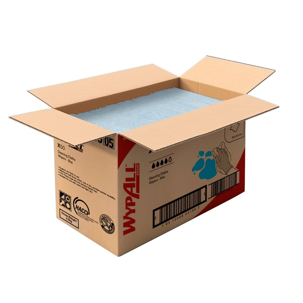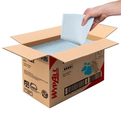 From wiping up grime, oil and grease to soaking up food prep spills, having the right wiper on hand is crucial to your operation. A clean and absorbent alternative to paper towels, rags and shop towels, WYPALL® offers a wide range of task-specific wipes and cloths designed to meet your industry, budget and absorbency needs.The WYPALL® X50 range of wipers are made with 4-plys of tissue which traps dirt and absorbs liquids fast. Plus they are reinforced with an additional layer of scrim, which wet or dry provides greater durability, making these wipers ideal for light to medium duty tasks involving grim and scrubbing. Single sheet dispensing ensures the user touches only the wiper they use promoting good hygiene in the workplace as well as limiting waste and overuse.Measuring 32.5 x 49 cm these large sized wipers enable you to achieve more with one wiper as well as being suitable for covering or protecting surfaces. These Wipers are certified by HACCP International and are compatible with KIMBERLY-CLARK PROFESSIONAL® wiper dispenser (4927) in smoke acrylic. Each case of WYPALL® X50 Reinforced single sheet, blue wipers consists of a box of 250 wipers, each measuring 32.5 cm x 49 cm. WYPALL® X50 Reinforced single sheet blue wipers, by KIMBERLY-CLARK PROFESSIONAL®, form part of a wider range of products designed to create a safer, healthier and more productive workplace.