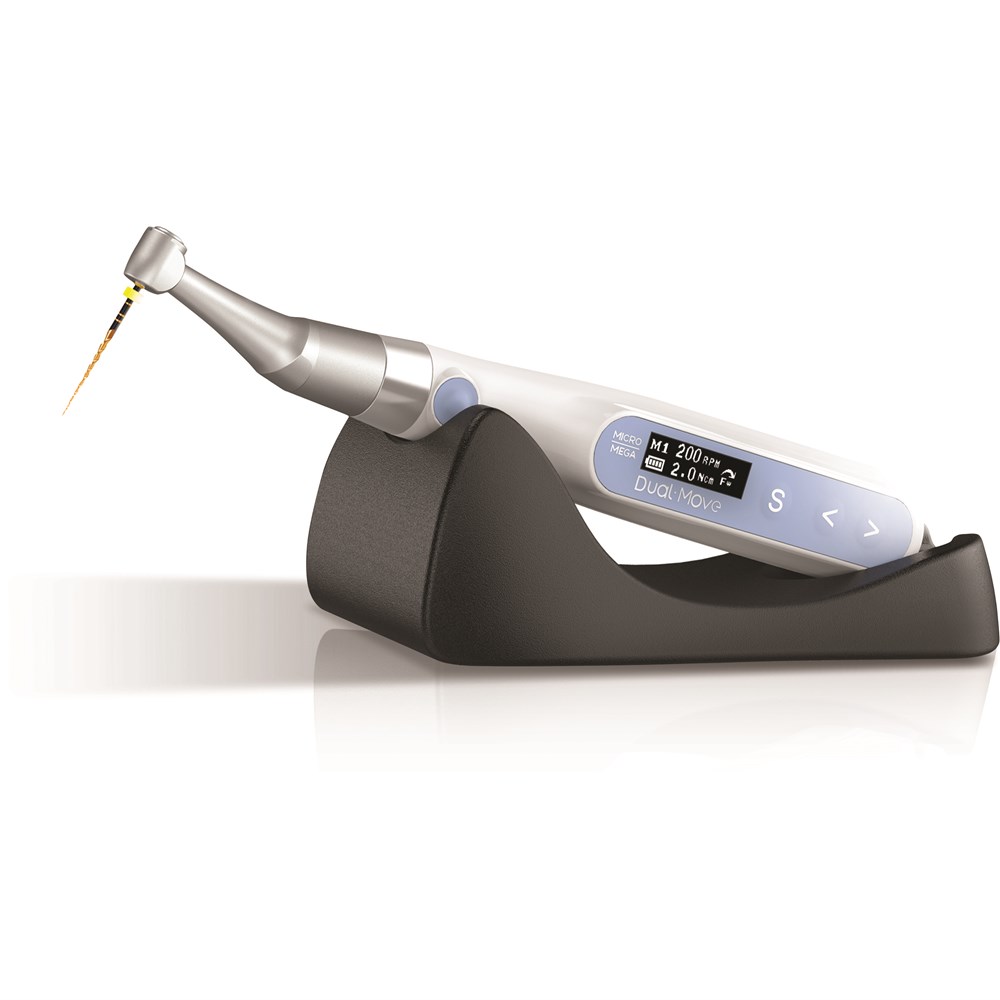 Using a cordless, well-balanced in hand and silent endodontic motor with control of movement, speed and torque, offers freedom and comfort, as well as an optimal security when shaping the root canals. The display turns around in order to suit to left-handers. The contra-angle rotates without being disconnected from the handpiece. Its miniature head and thin neck make it easier to reach the posterior teeth while keeping an excellent visibility on the root canals inlets and working area. Functionalities, high level of customisation, as well as advanced features that are available when combined with the Dual Pex apex locator, make Dual Move the ideal portable device for individual practices, in continuous rotation or reciprocating movement
