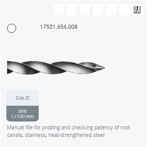 Manual file for probing and checking patency of the root canal. Stainless, heat-strengthened steel. Size 008, 21mm, sterile Pk of 6 Short Plastic Handle