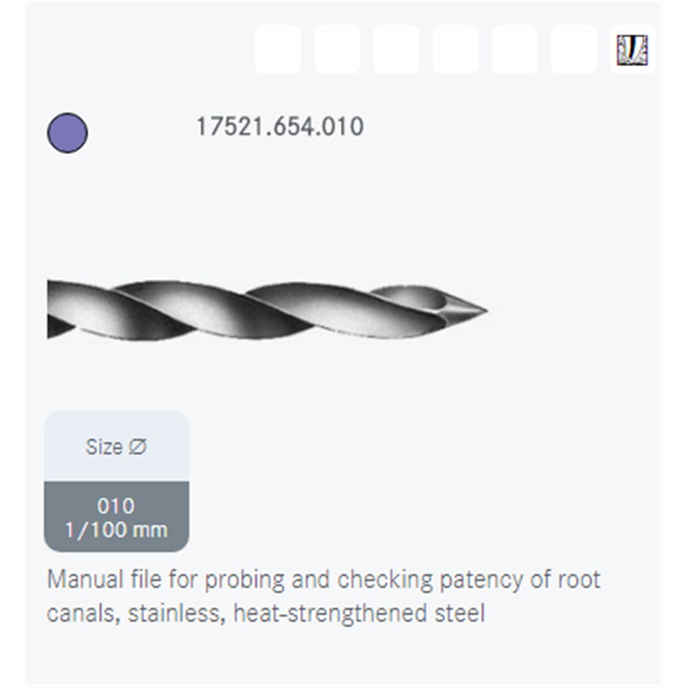 Manual file for probing and checking patency of the root canal. Stainless, heat-strengthened steel. Size 010, 21mm, sterile Pk of 6 Short Plastic Handle
