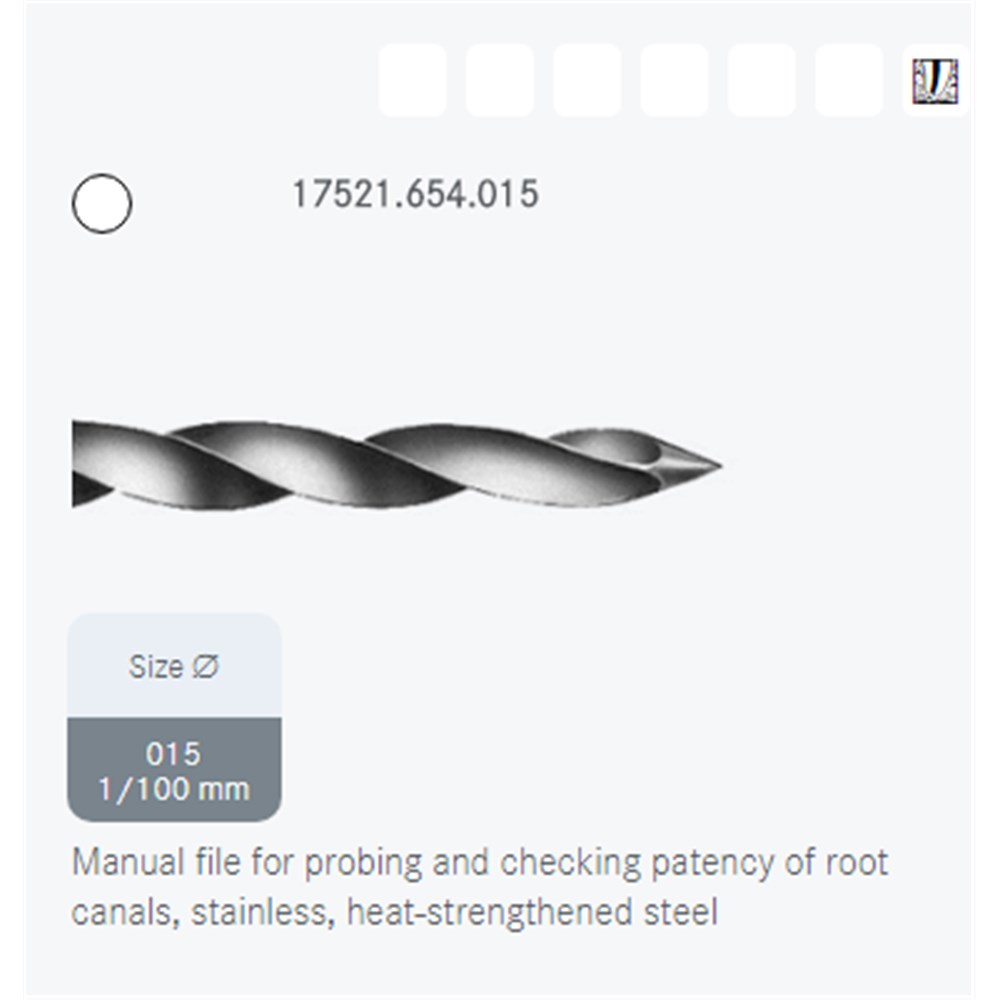 Manual file for probing and checking patency of the root canal. Stainless, heat-strengthened steel. Size 015, 21mm, sterile Pk of 6 Short Plastic Handle