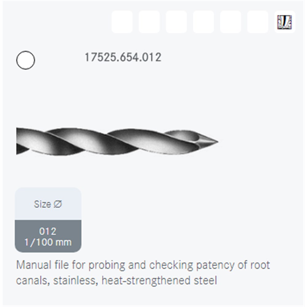 Manual file for probing and checking patency of the root canal. Stainless, heat-strengthened steel. Size 012, 25mm, sterile Pk of 6 Short Plastic Handle