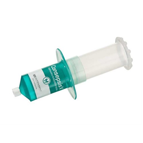 Consepsis V solution is a viscous formulation of Consepsis™ 2% chlorhexidine antibacterial solution. The viscosity of Consepsis V solution makes it the perfect disinfectant in most cases where you want to have more control than a liquid will give you. Consepsis V solution can be used as an antibacterial agent in the canal(s) between appointments.