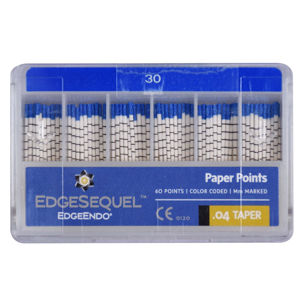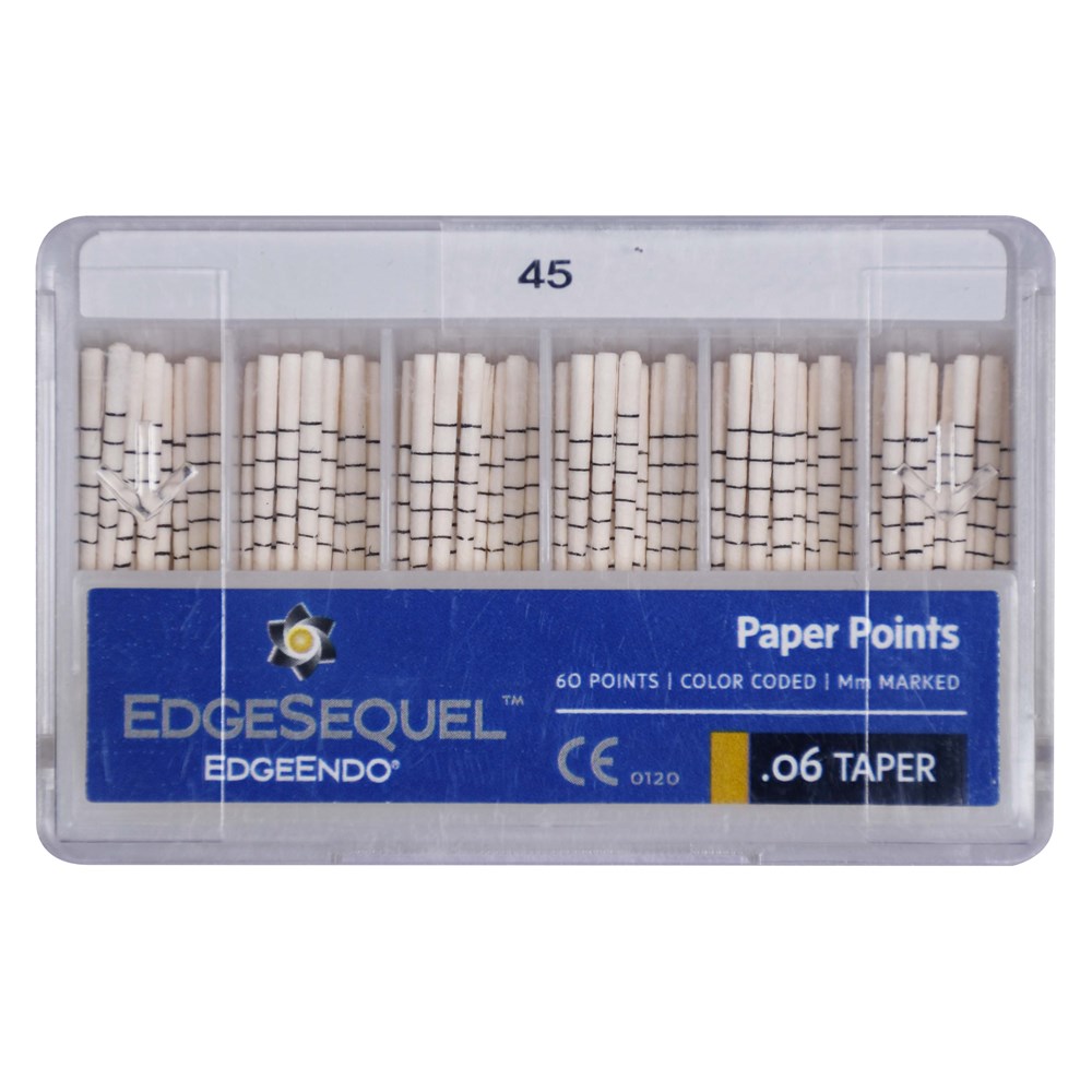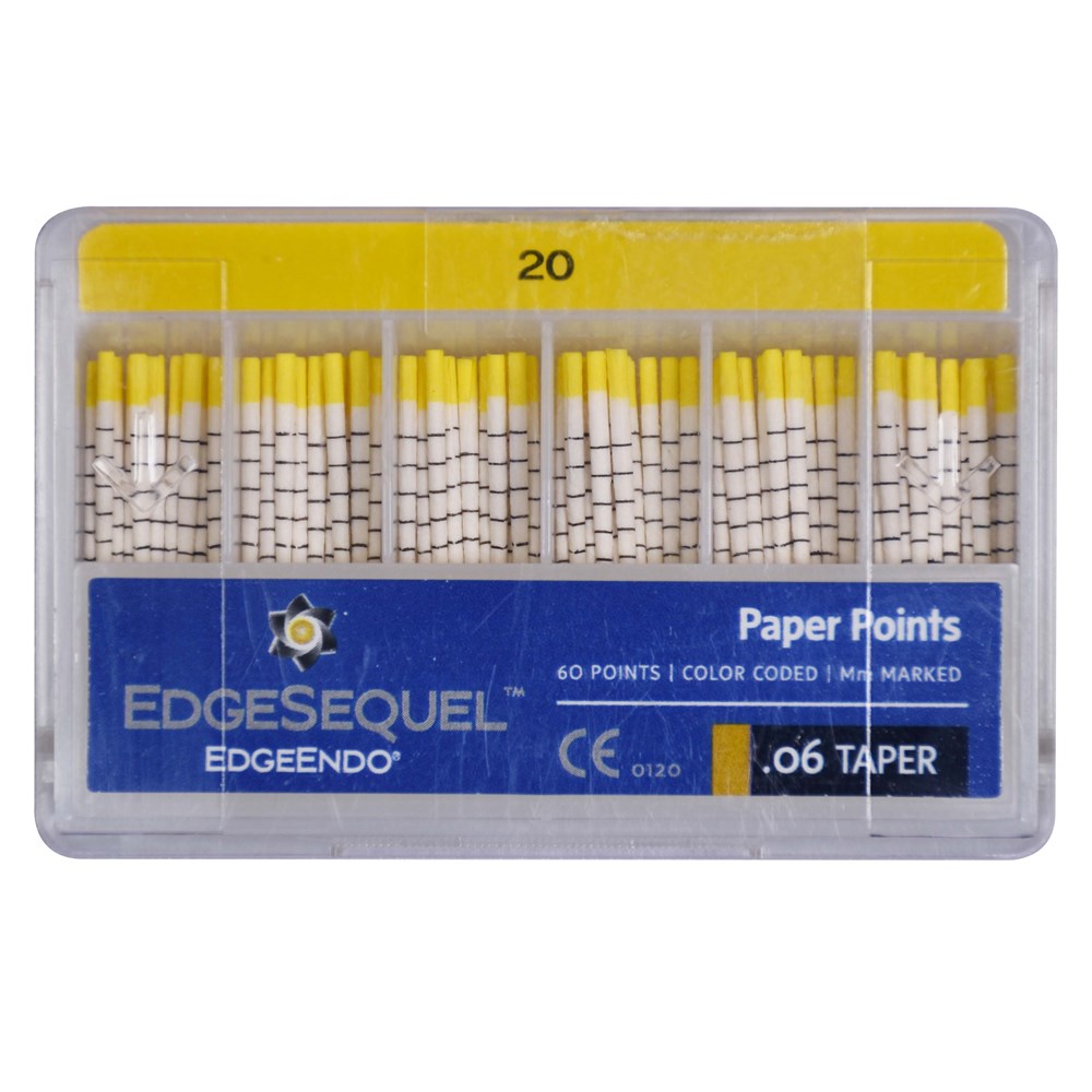 Our paper points are highly absorbent and come in sterlized packaging. They come in all the standard sizes, from 15 to 50 in .04 and .06 taper. Points are standard length 29mm +/-1 with marked lengths for accurate insertion. Each box comes with 60 points.