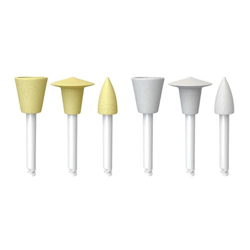 Available in cups, points, and disks and in medium or fine grit, the Jiffy One system is simple and convenient.