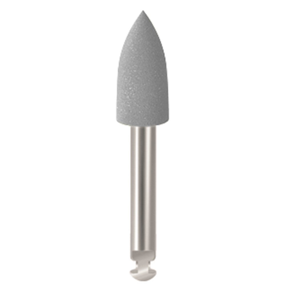 Two-step diamond polishing system for composites. The first step uses Medium polishers for finishing and contouring. The second and final step uses Diamond coated polishers for a high-luster finish. Metal shank (RA). Refill Box of 12.