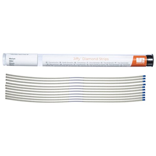 Jiffy strips and saws are made of stainless steel to resist breaking, offer a perforated design to assist in debris removal, and are thin and flexible to provide an optimal finish. They are autoclavable and have a diamond-free zone for easy insertion between teeth.
