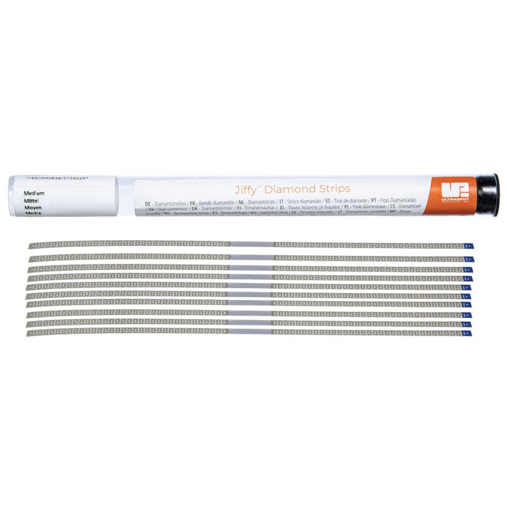 Jiffy strips and saws are made of stainless steel to resist breaking, offer a perforated design to assist in debris removal, and are thin and flexible to provide an optimal finish. They are autoclavable and have a diamond-free zone for easy insertion between teeth.