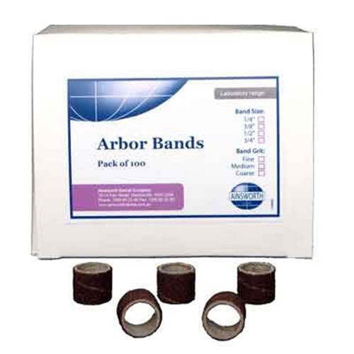 Silicone carbide abrasive bands for trimming and finishing of acrylics, silicone relines and other materials. Available in Fine, Medium, Coarse grits, and in sizes of 1/4", 3/8",1/2" & 3/4". Sold in packs of 100.