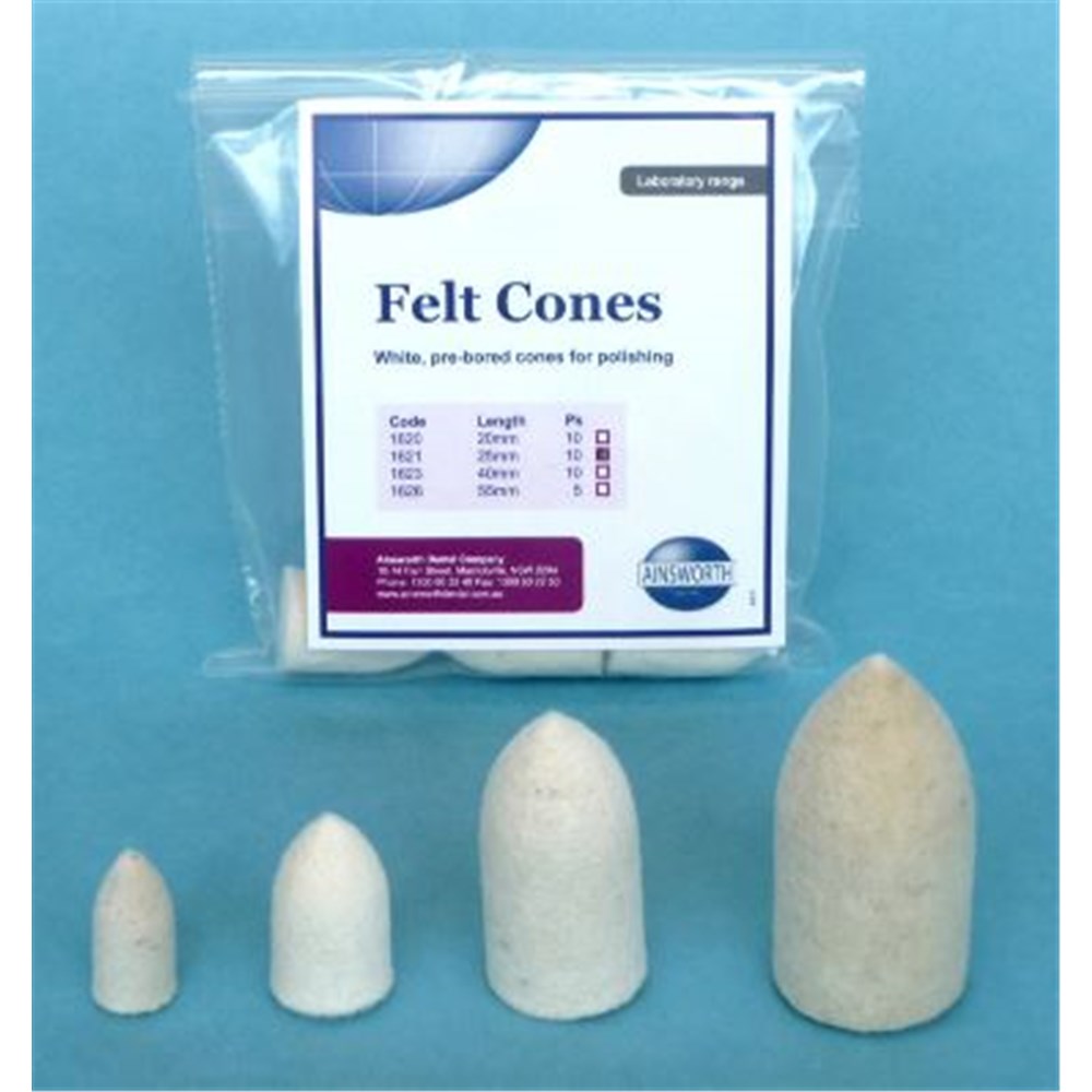 Firm pure wool felt cones for smooth finishing. Ideal for general polishing of most ferrous metals, stones, glass and ceramics. Made in the UK. Available in four sizes. Sold in packs of 10.