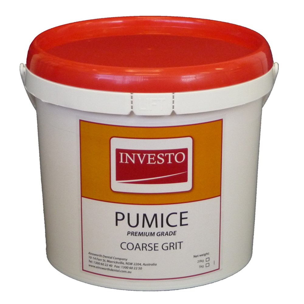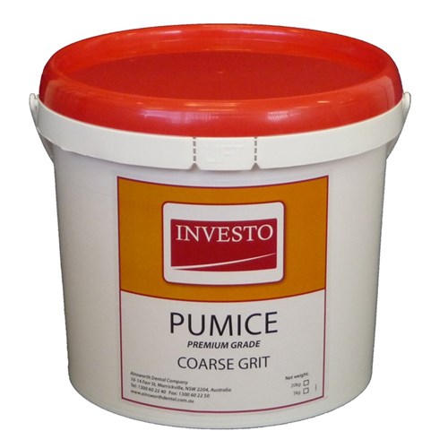 Investo Coarse Pumice is a superior quality coarse abrasive agent used in many polishing procedures. It is usually mixed with water to form a thick paste and is used in conjunction with a buff or brush wheel on the lathe.