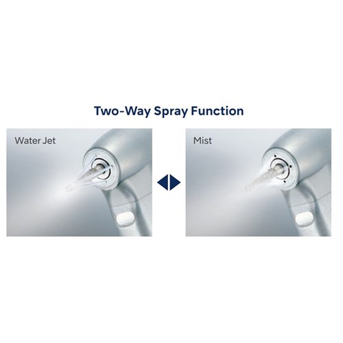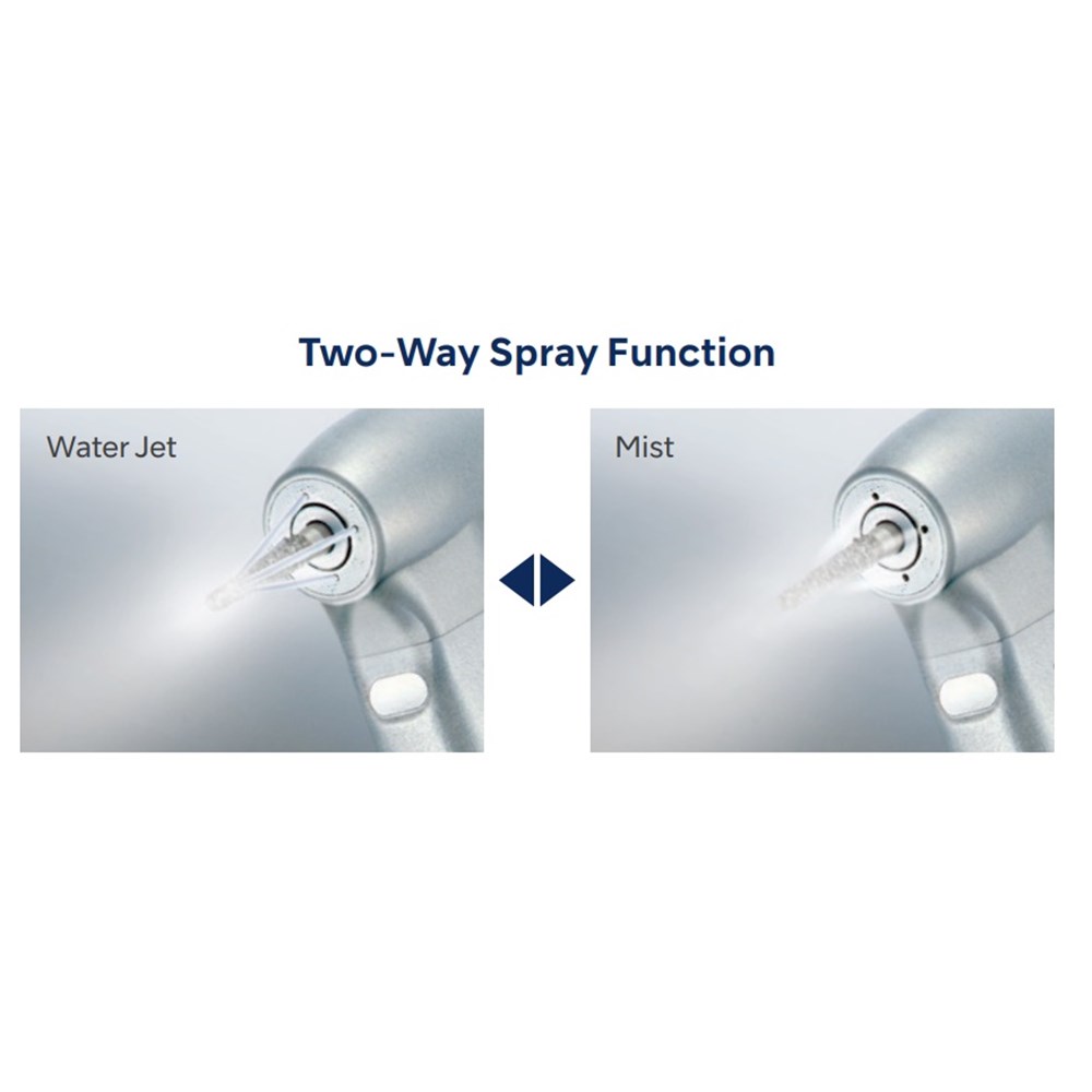 The world’s first two-way spray function allows you to instantly choose between a mist or jet spray. Chose in an instant depending on the conditions and procedure. The water jet spray prevents subcutaneous emphysema in surgical procedures whilst still cooling during restorative procedures. When spray mist can be used again without restriction just switch again. No equipment modification required. Switch between water jet (water only) and water spray (water and air mist) in an instant. Specifications: – Gear Ratio : 1:5 Increasing – Coolant Design : Quattro Ports (with two way spray function) – Body Material: Titanium Body Coating DURAGRIP – Max Speed 200,000 min-1 Features: Anti Heat System Cellular Glass Optics Ceramic Bearings Clean Head System Push Button Chuck Microfilter
