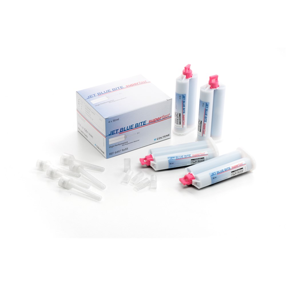 Jet Blue Bite bite registration material flows with a smooth whipped-cream consistency exactly where you want it in a predictable quantity and ideal ribbon pattern. It offers a fast oral setting-time and sets rock hard for greater accuracy but is still flexible enough for easy trimming or cutting. The superior handling characteristics are the key for a perfect occlusal fit on the first try.