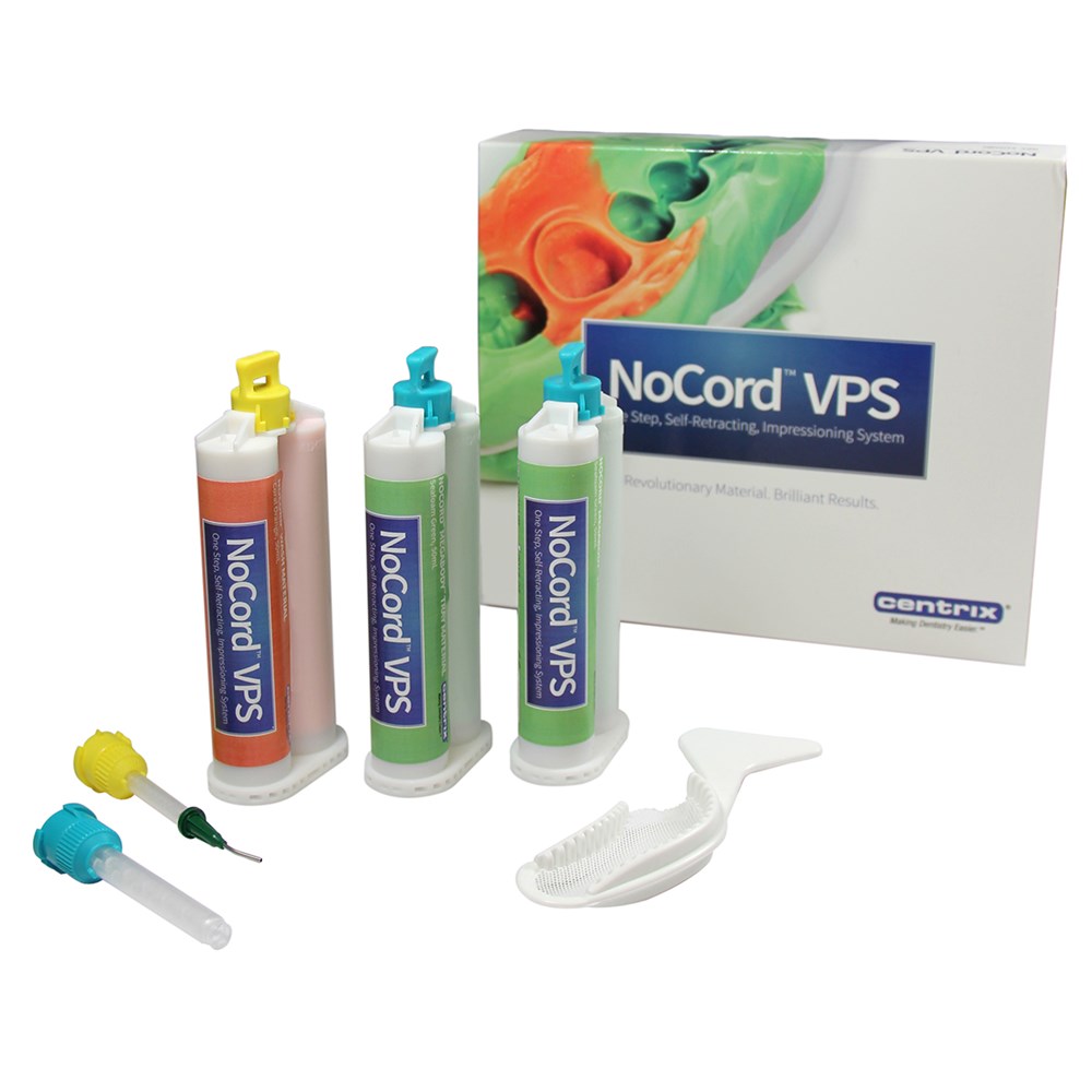 The NoCord™ VPS Introductory Kit is a revolutionary one step, self-retracting, impressioning system designed specifically for the wash and tray technique. It consists of the Centrix NoCord™ Wash and NoCord™ MegaBody™ Tray Materials which together produce highly accurate dental impressions without the need for retraction cords and pastes.
