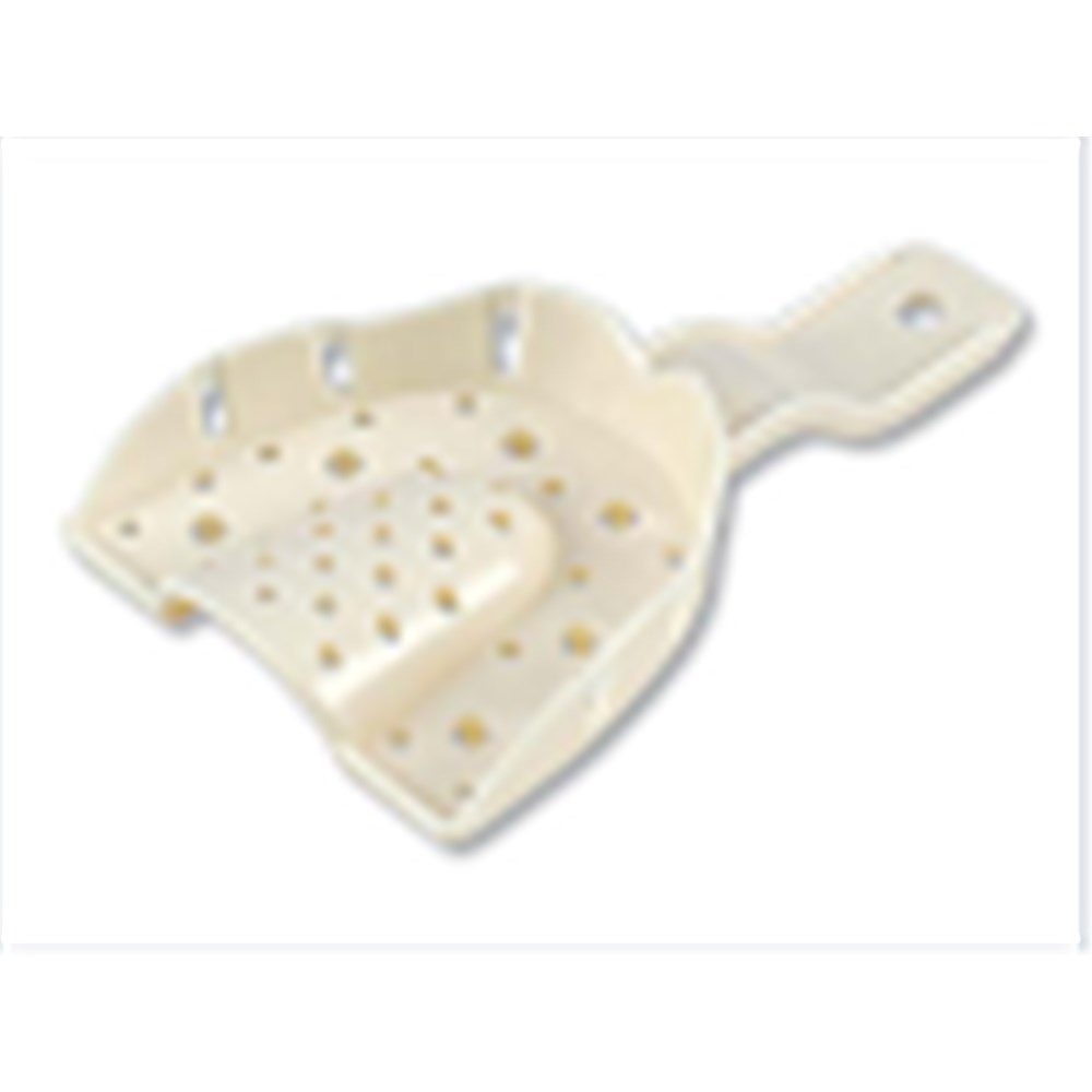 Disposable impression trays made from white plastic. Inexpensive and solid, with limited mouldability when heated. Excellent retention of the impression material via special 'retention baskets'. Available in six sizes. Can be used without adhesive and will suit any impression material.