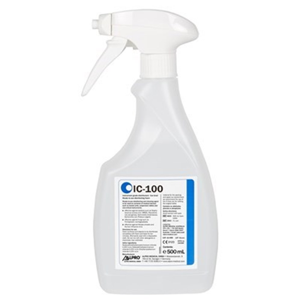 Immediately after treatment completely moisten the surface of instruments with IC-100. Let it take effect for at least 5 – 10 minutes, rinse instruments under running water and continue with ultrasonic cleaning. For surface cleaning can be used with Maxiwipes, previously soaked in IC-100 or sprayed on the cloth of your choice to immediately wipe the desired surfaces.
