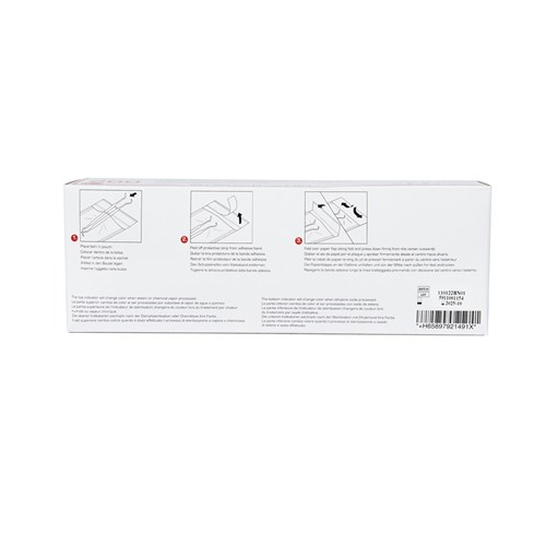 All imprints placed outside the actual packaging area – no ink-contaminated of the items. High quality, porous 60 g/m2 medical grade paper.