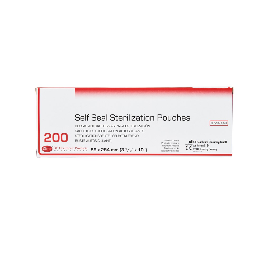 For use as packing material for medical devices in sterilization by steam, ethylene oxide gas in healthcare establishments. The Self-Sealing Sterilization Pouches are single use.