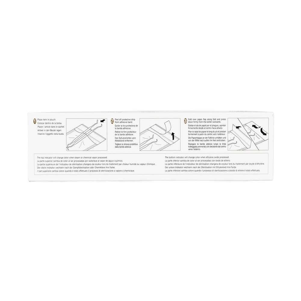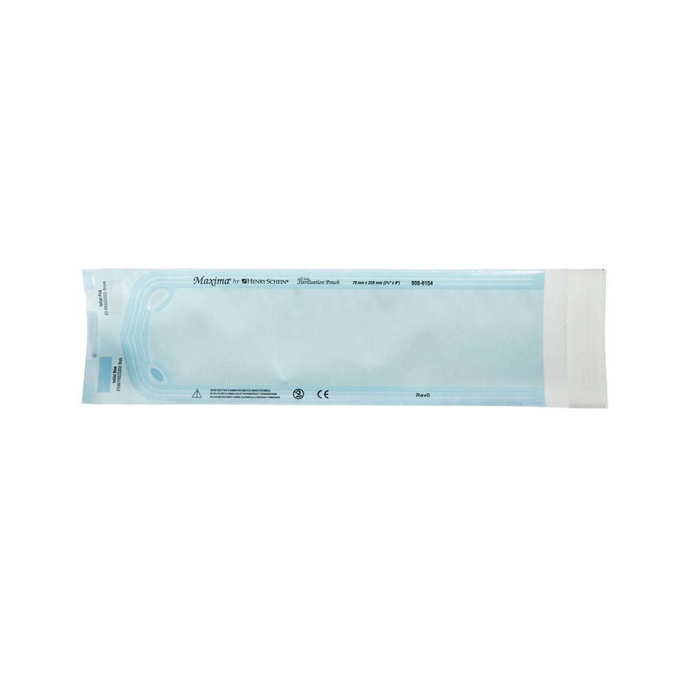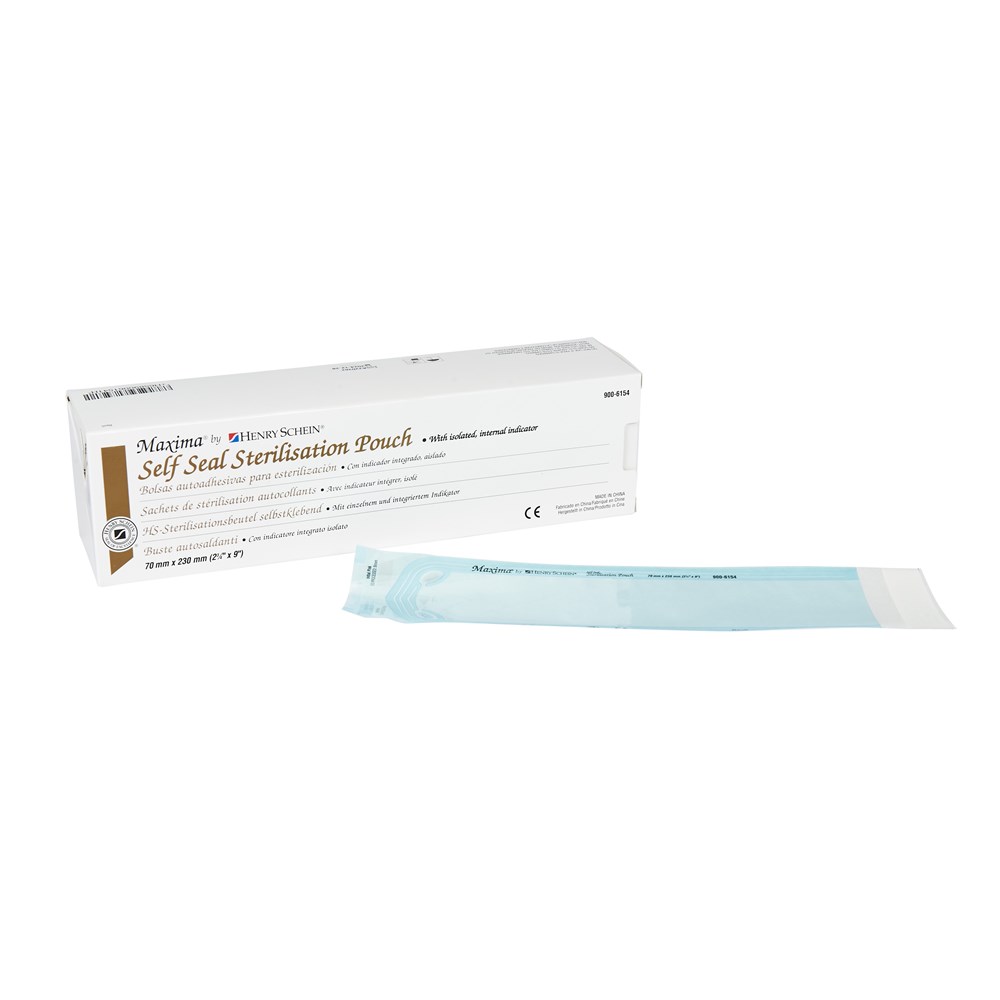 Class 1 Chemical Indicator Maxima Self Seal Sterilisation Pouches are for packaging dental instruments prior to sterilisation and storage once sterilised. These pouches have an external and isolated internal indicator for accurate reading. Designed to indicate that instruments have undergone sterilisation. Single use | Box of 200 Other sizes: 57x100 mm (2.25x4”) HS-9006153 70x230 mm (2.75x9”) HS-9006154 90x140 mm (3.5x 5.5”) HS-9006155 90x255 mm (3.5x10”) HS-9006156 133x255 mm (5.25x10”) HS-9006157 190x330 mm (7.5x13”) HS-9006158 230x380 mm (9x15”). HS-9006159 Standards: Conform to the EN 868-5, ISO 11140-1,and ISO 11607-1.