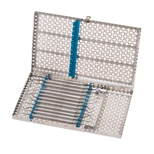 Cassette holds 12 instruments with an accessory area and fits in the SciCan STATIM or the Midmark M3 autoclave. Exterior Dimensions 6.5" x 10.5" x 1.25" (165 mm x 267 mm x 32 mm).