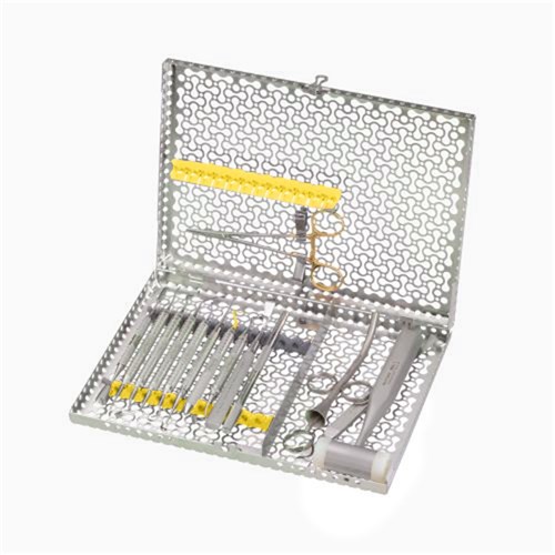 Cassette holds 12 instruments with an accessory area. Exterior Dimensions 8" x 11" x 1.25" (203 mm x 280 mm x 32 mm).