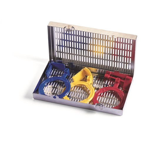 IMSĀ® cassettes are made of long-lasting, low-maintenance stainless steel. Soft, colored silicone rails securely hold instruments throughout the processing cycle. Available in over 100 different sizes, configurations and color options, and can be speciali