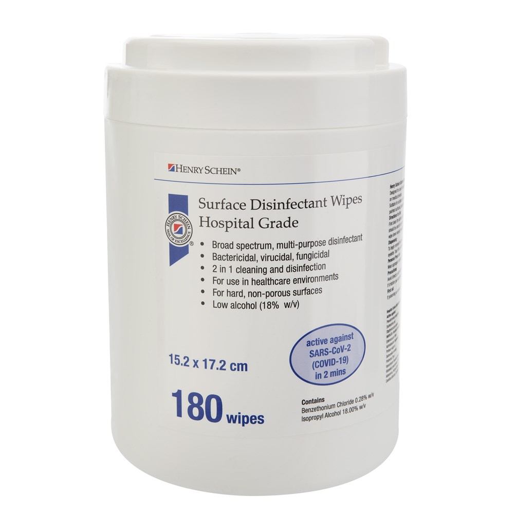 Henry Schein Surface Disinfectant Wipes are a premium quality wipe soaked in a cleaning and broad-spectrum disinfection solution. Developed to reduce cross contamination in healthcare environments, they provide fast acting disinfection including activity against SARS-CoV-2 (Covid 19) in 2 mins.