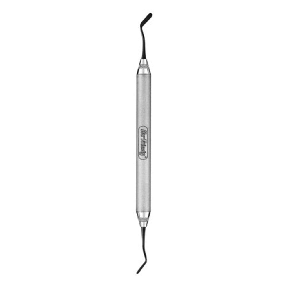 Satin Steel XTS Aluminium Titanium Nitride Coating resists scratches & sticking. Unique black finish offers enhanced contrast between instrument, tooth structure & composite. Smooth, Large, Lightweight handle design.