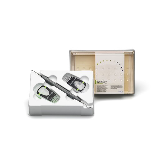 Modelling instrument with special foam pad attachments to facilitate the non-stick placement of anterior composite materials. The highly synthetic foam, which come in two sizes, optimally adjust to the tooth shape and allow fillings to be smoothly contoured.