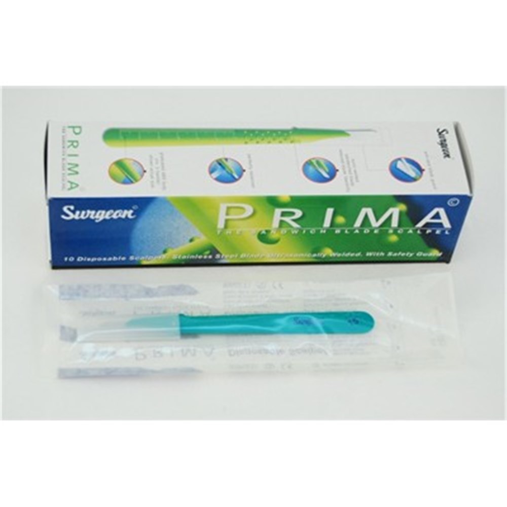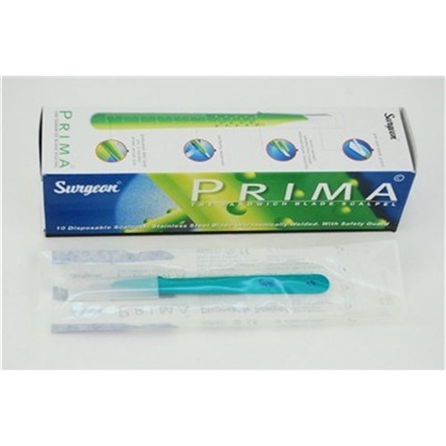 Prima Disposable Scalpels feature a stainless steel blade fitted onto an ABS plastic handle that features a safety blade guard.