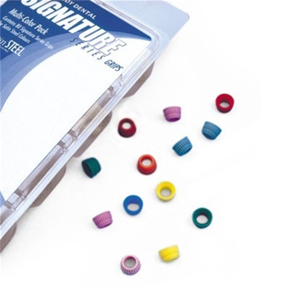 Instruments automatically include black Signature Series Grip. Coloured Signature Series Grips can be easily fitted for identification of instrument by operator or procedure. Contact your Henry Schein / Halas Representative for full range of Instruments available in satin steel colours.