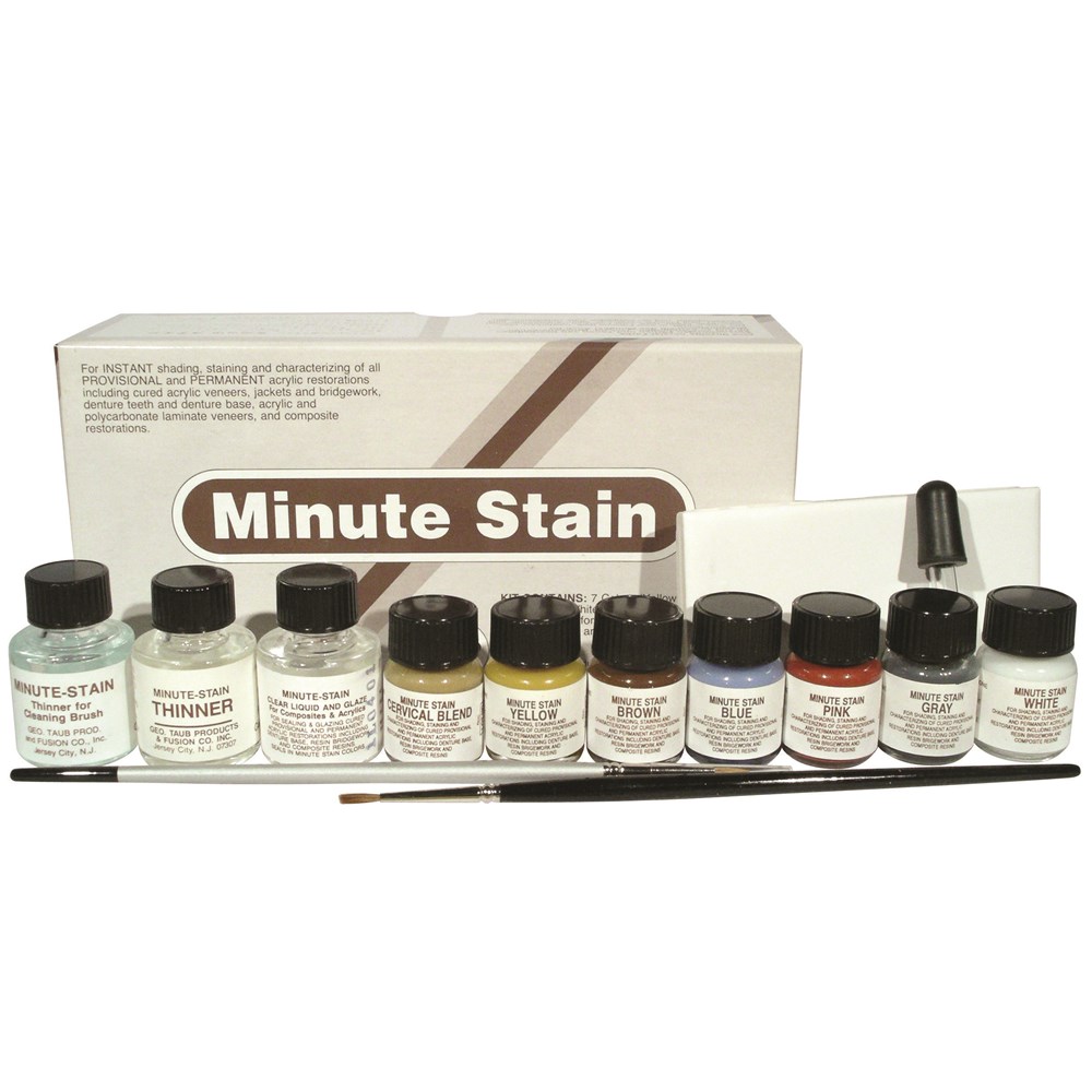 Minute Stains are quick setting colored acrylic liquids that are applied by brush to modify the shades of provisional and permanent acrylic and composite restorations. The stains cure and bond to all dental resins, including ethyl and methyl methacrylates, bis-acryl resins, polycarbonates, vinyl methacrylate copolymers, resin crowns and laminates, denture base, acrylic denture teeth and composite resins. Minute Stains can be applied in or out of the mouth.