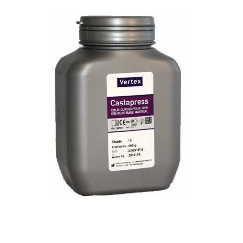 Vertex Castapress is a self polymerizing pouring/casting type denture base material also suitable for repair, relining, rebasing and extensions of partial dentures. Pouring time (at 22 ° C) up to 3 minutes Dough time (at 22° C) 6 minutes Curing time 30 minutes at 55°C and 2.5 bar Powder 500g Shade 4 Clear