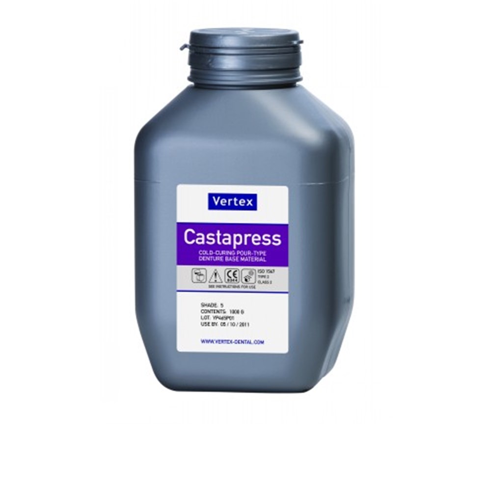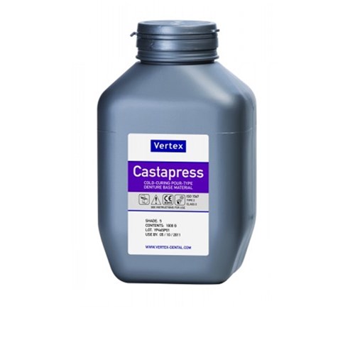 Vertex Castapress is a self polymerizing pouring/casting type denture base material also suitable for repair, relining, rebasing and extensions of partial dentures. Pouring time (at 22 ° C) up to 3 minutes Dough time (at 22° C) 6 minutes Curing time 30 minutes at 55°C and 2.5 bar Powder 1000g Shade 5 Pink Veined