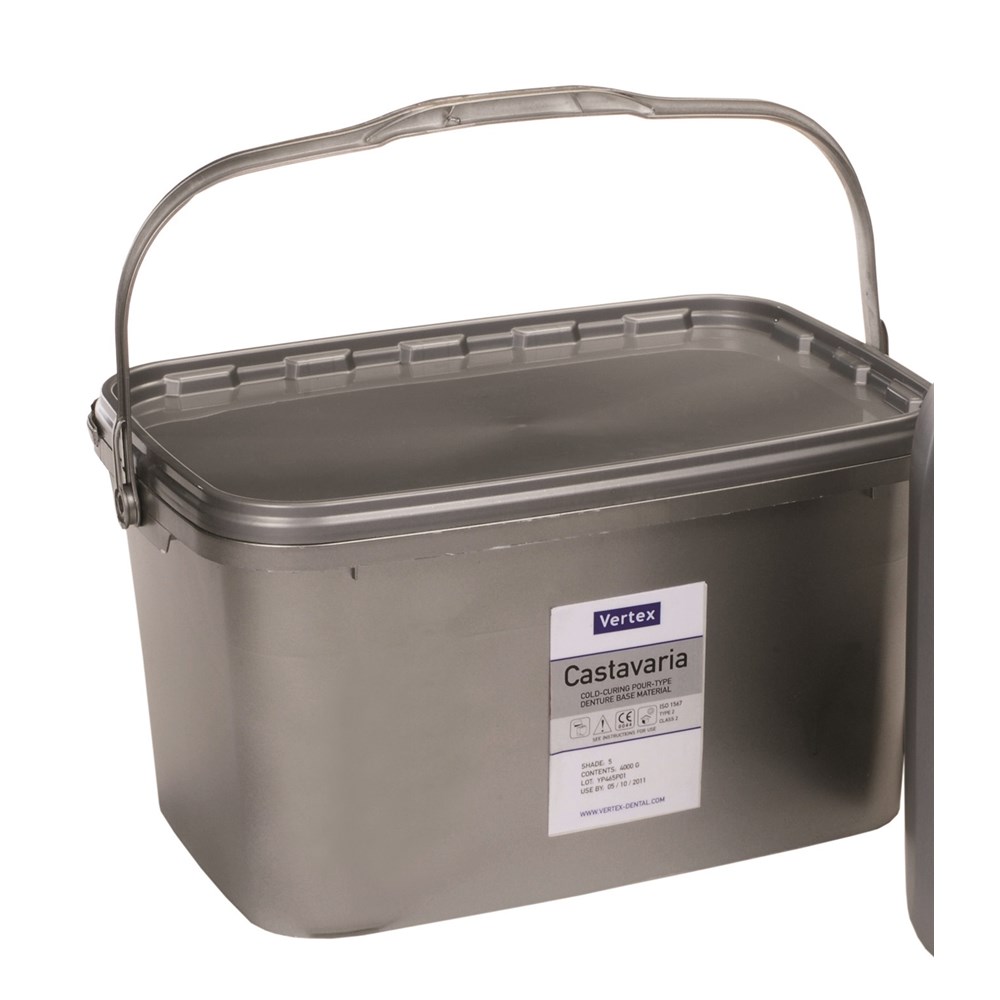Vertex Castavaria is a multifunctional self polymerizing acrylic which is perfectly useable as a pouring, relining, rebasing and as a repair acrylic. Pouring time (at 22 ° C) up to 4.5 minutes Dough time (at 22° C) 13 minutes Curing time 30 minutes at 55°C and 2.5 bar
