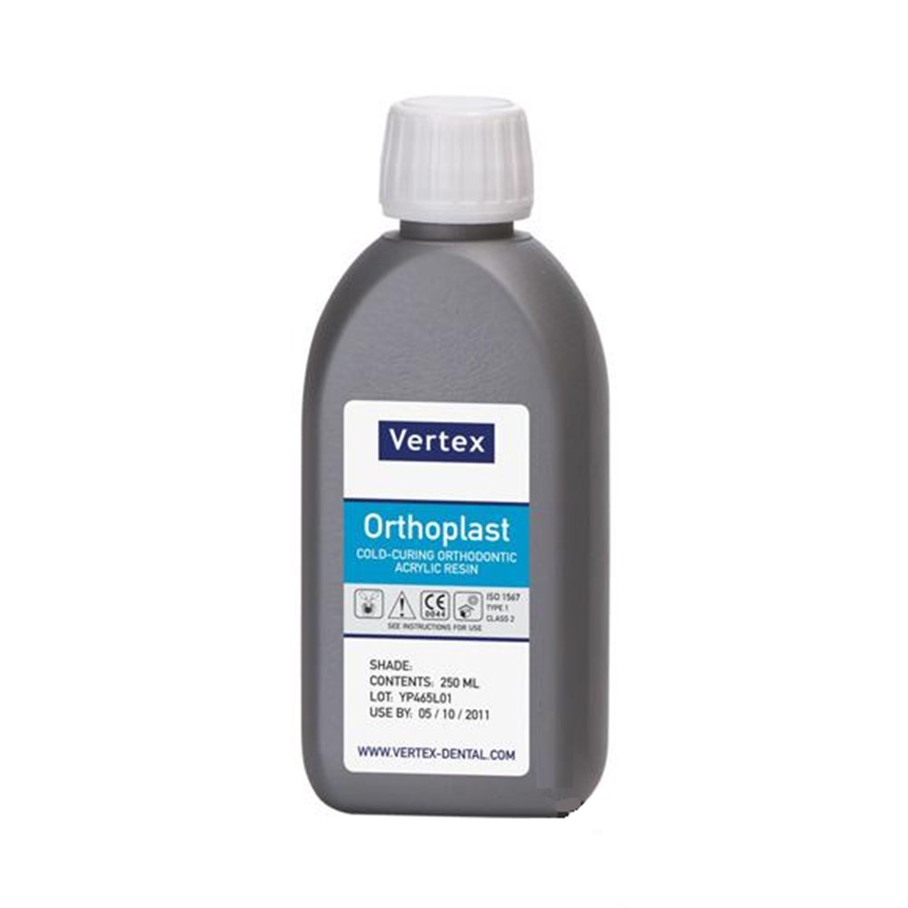 Vertex Orthoplast is a self polymerizing acrylic for orthodontic appliances. Its unique grain structure makes this acrylic suitable for the spray-on technique. Pouring time (at 22 ° C) 9 minutes Dough time (at 22° C) 6 minutes Curing time 20 minutes at 55°C and 2.5 bar