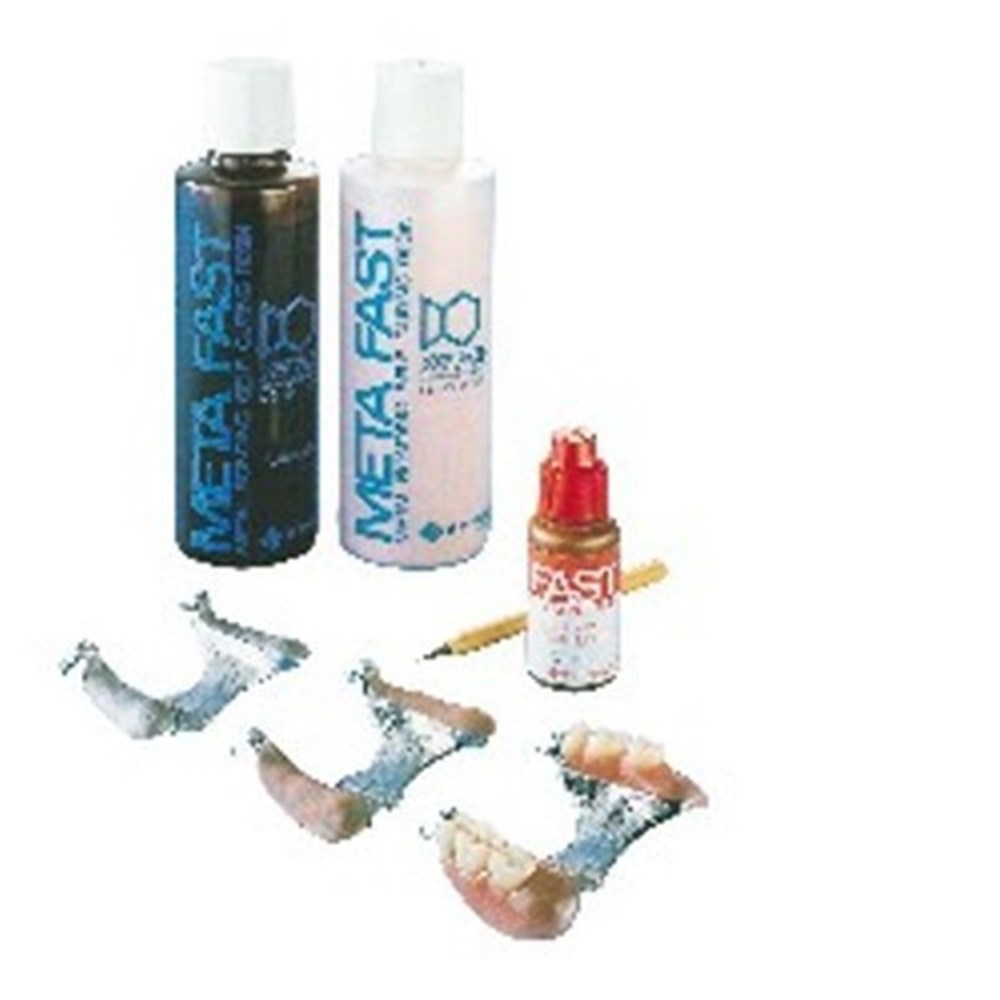 Metal bonding self-curing acrylic resin. Excellent adhesion to all metal surfaces for all types of repairs, additions and relining metal based dentures without retentions. The bonding liner provides unsurpassed resin-metal bonding with minimal preparation. Liquid 100ml bottle
