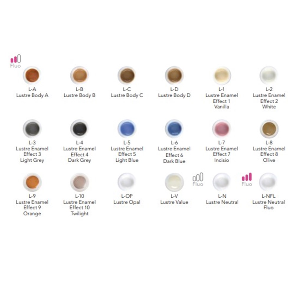 The Lustre Pastes ONE are specially developed to boost the fluorescence of monolithic restorations. Fluorescence can be boosted with Lustre Neutral FLUO (L-NFL).